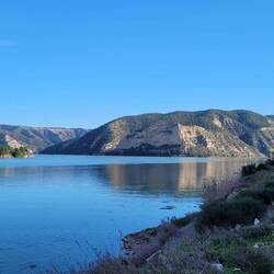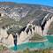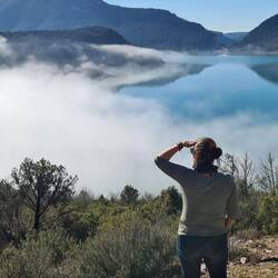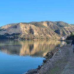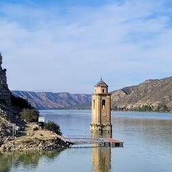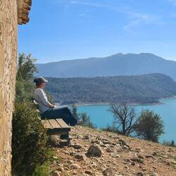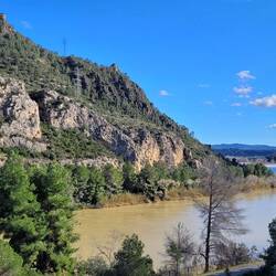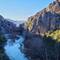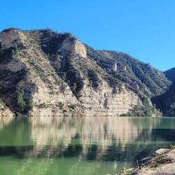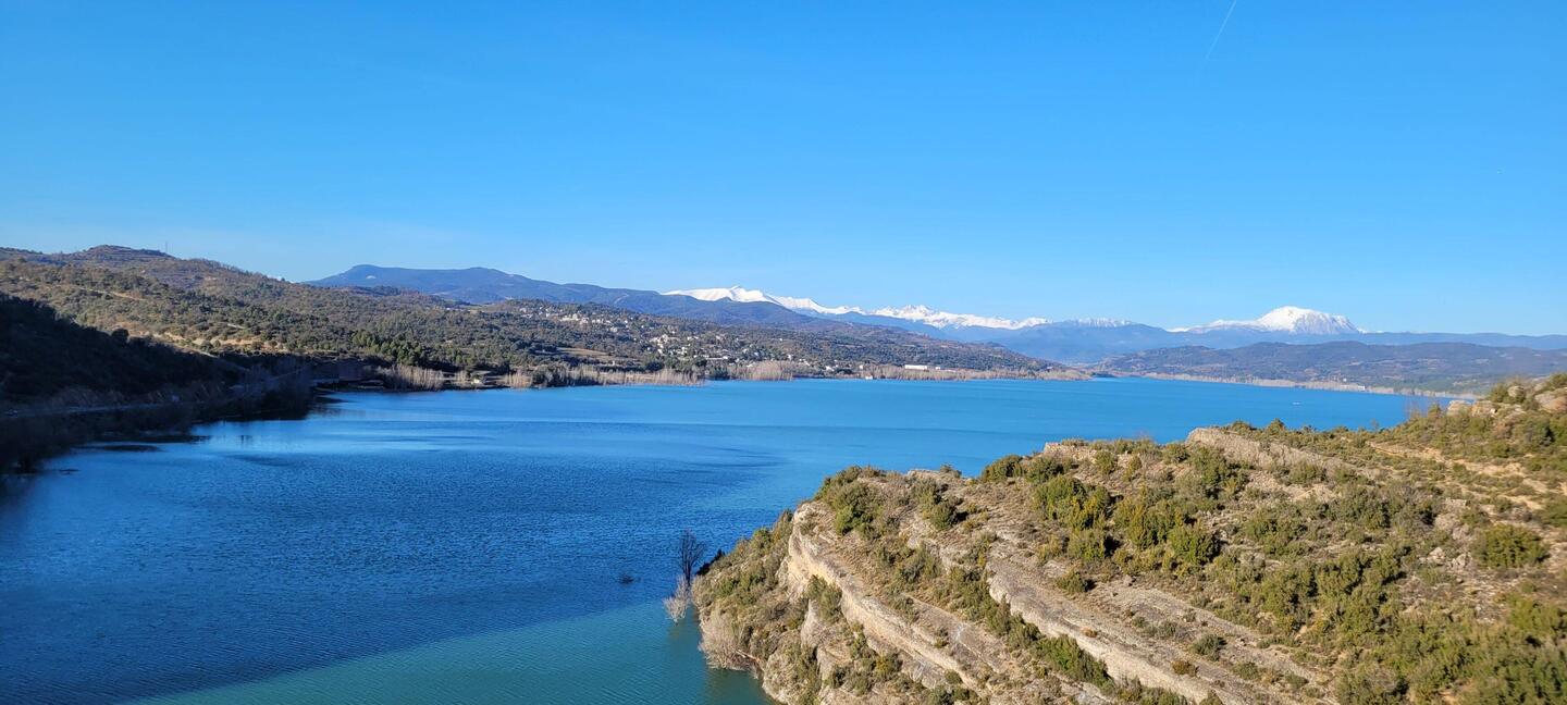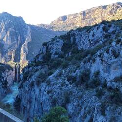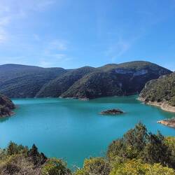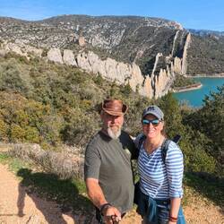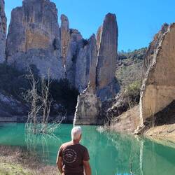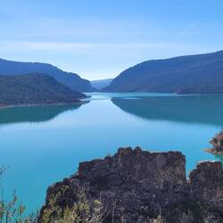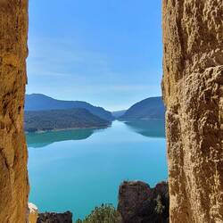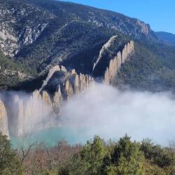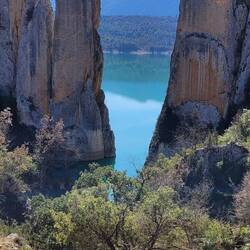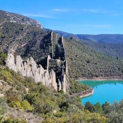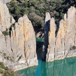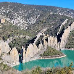 beeindruckende natürliche Felsformation in der spanischen Provinz Huesca. Die "Mauern" bestehen aus zwei parallelen Reihen vertikaler Kalksteinfelsen, die durch tektonische Kräfte aufgerichtet wurden und heute wie eine künstliche Festungsanlage wirken. Sie befinden sich am Rande des Canelles-Stausees, der an dem Tag richtig türkis leuchtet. Zwischen den Felszähnen der Mauer befinden sich die Ruinen einer mittelalterlichen Burg und die Einsiedelei San Vicente. Schon verrückt, wo der Mensch überall gebaut hat.