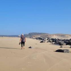 Am nächsten Tag fahren wir bis nach Oualidia, das bekannt ist für seine geschützte Lagune, die uns auf dem Weg von der Straße sofort ins Auge springt. So machen wir spontan Halt auf dem Camping Laguna Park etwas oberhalb. Auf dem Weg hinunter zum Wasser sieht es so richtig nach Urlaubsort aus mit Ferienwohnungen und ein paar Restaurants. Die Lagune ist größtenteils trocken, der Strand weiter unten wild und breit, das Meer aufgewühlt und die Sonne scheint.