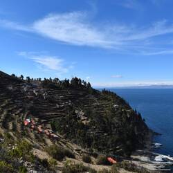 The view from the top was really lovely and we stopped for a few photos before continuing down to the other harbour, which now housed the boat. The path down was pretty steep and made up of those slippery shiny cobbles, which almost had me flying down them all. It was a really pretty town at the bottom, everyone was gathered here socialising. We didn't have time to stop though which was a shame. Considering we only had an hour on the island, compared to the three hours on the boat, it was a bit underwhelming to some extent. The views were great and the history of the island as the birthplace of the Inca's was interesting, but the only thing there to signify this was the small 'Temple of the Sun', which didn't take long to look around. It was good to get some exercise in though and we had another nice chat on the way back with Sarah and Sam.