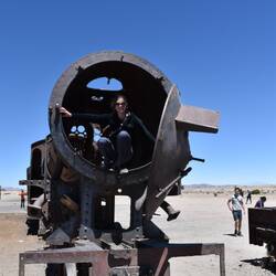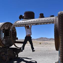 First stop on our tour was only a short drive from Uyuni into the desert. Here we came across a Cemetery of old coal powered trains that had been abandoned here when more modern trains took over in the mid 1900's. The railway line is still used about once a day, however in its hay day this was a very busy line, used to carry mining products to the coast for shipping. This was back when Bolivia owned the coastline and the trains. It was built in the late 1800's and the trains were brought over from England and the U.S., which is a pretty awesome feat. Now they serve as a reminder of the once busy line and act as a giant playground for adults.