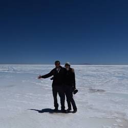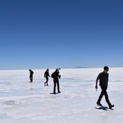 We got out of the car and immediately were blown away by the not only the vastness of the place, but also the emptiness. It is just flat and white as far as the eye can see, with the odd glimmer on the surface where the water still sat catching the sun. Walking on it was even stranger. It was a bit like walking on ice, as there were parts of the surface that were solid salt and then other areas that cracked under your feet, exposing them to the water below. Annoyingly it was really hard to tell the difference. Pablo also informed us that under the salt there is a massive lake, that reaches 120m in depth in places...amazing! We won't fall through though, the salt is meters thick.