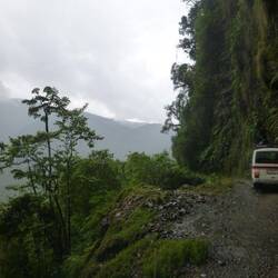 We soon carried on down and then came to another stop by a tunnel. We went around the tunnel on some rocky terrain, which was a bit of a mini test to see if would be OK on Death Road. Me and Rob took a bit of a stupid route and ended up going over the bumpiest parts and through all the puddles. We finished up covered in quite a bit more mud than anyone else but I was glad to have felt quite secure. Having never mountain biked before it was still going to take more convincing that the bike could make it over the bumps OK, but so far so good.