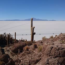 With the altitude (and my lack of physical fitness), I found it a little more of a difficult climb to the top of the island, especially as the air is so dry that panting just makes you incredibly thirsty and the rest of the group had walked ahead with the water...yay! But I made it in the end and the view was awesome. White salty desert as far as you could see in almost every direction, bordered by great, towering volcanoes in the distance. The only sense of scale that you could get of the place occurred when you saw the odd jeep speeding across the surface in the distance, a tiny ant size dot against the white.