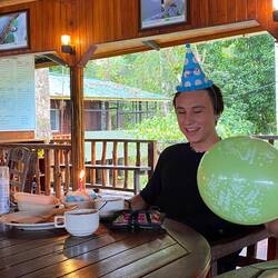 6 p.m. - I was so happy when we went back to the lodge. So a day that started really bad turned out to one of the best in my life and it was my birthday as well. The rest of the evening we were just chatting with new arrivals and played some games. They even bought me a bottle of white wine and we just had a relaxed evening. Later we went for another night walk on the canopy walk but we saw nothing interesting that time.Read more