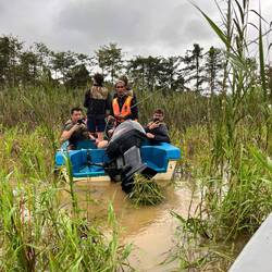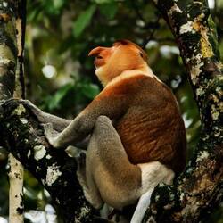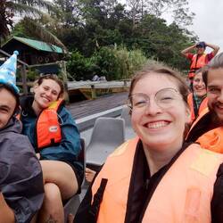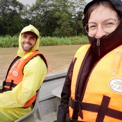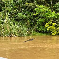 3:30 p.m. - We started our last river cruise a bit earlier than planned and went quite far down the river. Luckily we saw some cool birds like the stork billed kingfisher, hornbills and some others. Furthermore we also saw a lot of macaque monkeys with we skipped today and some proboscis monkeys again. Suddenly the ranger discovered a crocodile somewhere near to the shore. At first I thought he is joking but when we came closer I saw it. From far away it looks like a huge log in the water. We went really close to it and it was amazing. It was a huge one and just chilling in the river going with the current and we were near it. You could hear all the monkeys screaming to warn the others. It was breathtaking beautiful but a bit scary at the same time. I was already very happy and satisfied. The further we went down the river the more old orangutan nest’s we saw. Orangutans build every evening a new nest with leaves somewhere in the top of a tree. So I had the hope to see some wild orangutans and suddenly I discovered something brown in the trees. So I told the ranger to turn a round a have a closer look. It was actually a orangutan and not only one there were two. A mother orangutan and her almost grown our baby. I couldn’t imagine my luck. We could saw the just with our eyes but it was way better with binoculars. It was insane to see them so clear and just watch them. The mother taught the baby actually how to swing properly from one tree to the other. He tried and tried for a couple of times until it worked out and the mother was just watching and helping a bit. It was amazing so words needed. Another boat came to see the monkeys as well and the were stuck at the shore so we had to help them out.