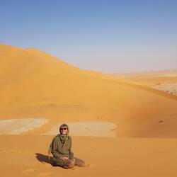 Along the road, in between the dunes, I find the Germans again. We are trying unsuccessfully to get into the Oroug Mani M’aradh Wildlife Sanctuary, where the extinct Oryx has been reintroduced into the wild, herds of Arabian Sand Gazelles and Ostriches are roaming again. We are not lucky, the only road in this area we find is too sandy for us to access. So, we give up and travel further up the road, where Steffen and Birgit know for another access point to be. Here we learn that you can only access the reservation after prior permission by the Saudi department for the environment. But being in Saudi for quite a while now, we know, waiting a bit may bring results as well. We don’t have to wait for too long and a ranger comes along. After a short chat, we all scramble into his vehicle. And off we go into the wild. And what a ride that was! This guy really knew how to ride the dunes. After dropping a lot of air out of his tires we climbed up the highest dunes, raced along a steep tilted slope around the inside of a huge sand crater, (scary!!!) down the steep valleys, around the corner and up some more steep dunes. And even he got stuck! But as Saudis don’t get out of the car, unless absolutely necessary and don’t dig, he just put the foot to the pedal, steered left right left right…. Until the car decided that’s enough and moved again. (I’ll have to tell Lola that trick). Yes, and we even spotted an Orys; over there, on the faraway sand dune, that white spot!!!