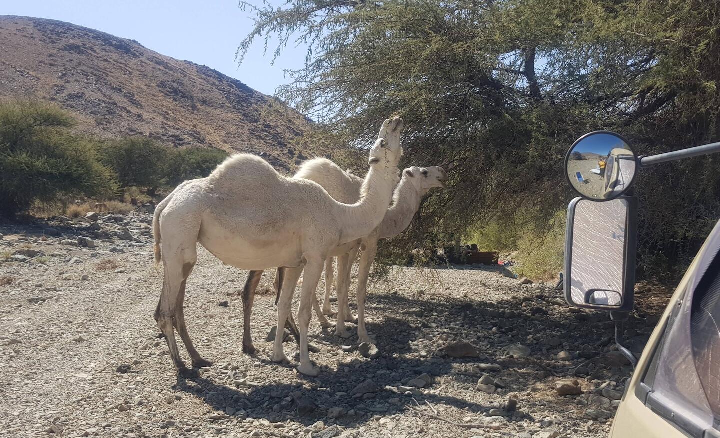 Finally Lola comes into sight. A car parked beside her. Limping closer, I see that two guys are looking into the van and are trying to open the doors. I call out to them. They sit down on my two chairs. The normal greetings ritual. The guys, late teens, early twenties, sitting down with their legs splayed, check me out from top to bottom. They want to see the inside of Lola. I don't like these guys, don't trust them, so no sightseeing today. But you know what, I would like to sit down on my chair, injury you see, donkey... No, they say, we are not getting up. After quite lengthy "discussions" I tell them to leave, but they don't. Now I am getting quite furious, an emotion you should never show in Saudi! This diminishes your position, but what can I do. Where is an "escort" when you need one!
