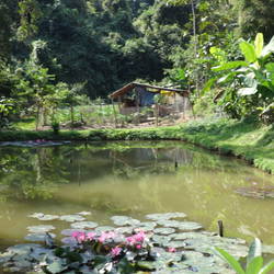 Nous sommes installés dans une guesthouse loin de l'agitation : petit bungalow dans un jardin luxuriant avec vue sur les pics karstiques (photos).