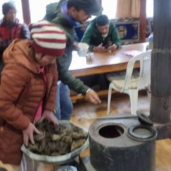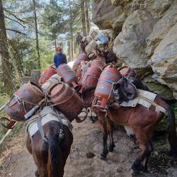 Leaving Namche we were immediately into the pine forests again. After a few minutes we stopped at the check point and picked up a couple of kilograms of prepared recycling in dry bags that they askLeia mais