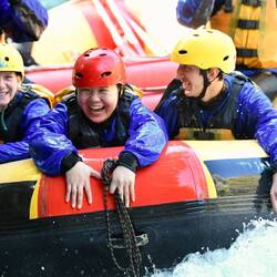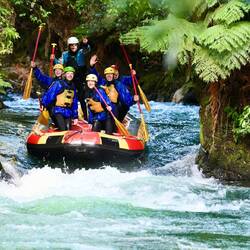 Emily Embo🇬🇧Rafting As mentioned in the last entry, on Friday we went rafting. My colleagues and I were looking forward to an hour full of water fun on the Kaituna River, which boasts three waterfalls, one of which is seven meters high and therefore considered the highest commercially navigable waterfall. Two friends from France were sitting in the front of the boat; they didn't understand much of the briefing, which might be for the best. Because when the guide told us about everything that could happen when we shoot down this waterfall, I got a bit nervous. In the best case, we all stay in the boat, right side up, and continue. But the raft could also flip over, then we have to hold onto the air bubble that forms under the raft and wait for his signal to flip it back. It could also happen that one gets thrown out and the current of the waterfall whirls one underwater, like in a washing machine. Then you should curl up into a ball and hopefully the waterfall spits you out again. Well, that didn't sound so fun, but now there's no turning back. We often practiced our safety position, but as you can see in the photos, our French front didn't quite understand it. They also got thrown out, but luckily didn't end up in the washing machine. We almost tipped over, but luckily we didn't! After we picked them up, it was smoother sailing. Now we could enjoy the beautiful nature.