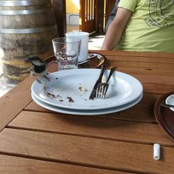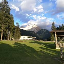 Ottima birra e patatine ai piedi della Marmolada su un bellissimo tavolone di legno all'aperto.