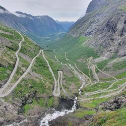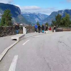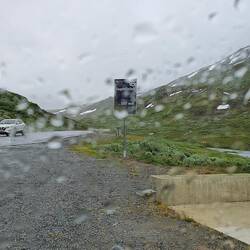 Strada panoramica di montagna più importante della Norvegia, ma visibilità 30 metri. Sosta pranzo in macchina coi panini della colazione.