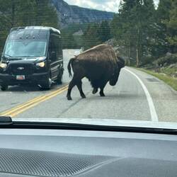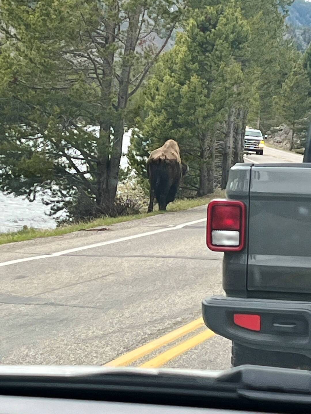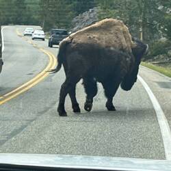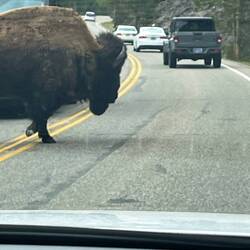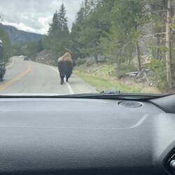 Here in Yellowstone, we like to end our day with bison in the road. This time our friend decided to change sides of the road very abruptly and right in front of us. Cool view of him but you have toLäs mer