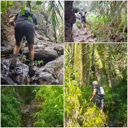 Am Sonntag die "kleine" Wanderung zum Wasserfall oberhalb El Gurro. Was zuerst unscheinbar tönt, entpuppt sich als veritabler Pfadfinder-Steig, durch steile Hänge und verfallene Terrassen, dann durch Schilf-Tunnels und teilweise im Bachbett verlaufend, über Felsbrocken und von Stein zu Stein die sumpfigen Stellen überwindend. Am höchsten Punkt lohnt der Wasserfall, der zwischen engen Basaltfelsen in ein Becken fällt. Dieses kurze Tal oberhalb El Gurro sei das einzige der Insel, das ganzjährig Wasser führt. Entsprechend üppig und artenreich ist die Natur hier, wo nebst vielen Kakteen-Arten und Blumen auch Nispeln, Dattelpalmen, Papyrus, Schilf und die Gomera-Weide gedeihen.