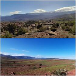 Durch weite, flache und teils Plantagen-bestückte Ebenen geht es weiter in die "Voralpen-Landschaft" bei Demnate. Hier geraten wir erneut in einen Souk und lassen uns von diesem authentischen ländlichen Treiben gerne mitziehen. Zwei Tajine-Garnituren, eine Couscous-Platte und ein Upcycling-Tajine-Kochgestell (alles zusammen für 140DH, ohne zu handeln) müssen ab jetzt auch mitfahren.