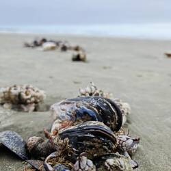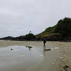 De wandeling over het strand is echter wel heel erg mooi om te doen. Je ziet er surfers, kunt schelpjes zoeken, wandelt tussen verschillende mooie rotsformaties. Wat we ook wel zien, jammer genoeg: heel veel aangespoelde, dode dieren... Ontelbare krabben, zeesterren, mosselen, oesters... en ook: een zeeleeuw! Laat ons hopen dat het allemaal via een natuurlijk dood is gegaan...