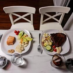 Aangezien we toch wel twee lange dagen achter de rug hebben met samen bijna 14 uur reizen, trakteren we ons 's avonds op een uitgebreide, zelfgekookte maaltijd. Steak, zalm, rauwkost, hummus en een fles van 1l rode wijn (dat laatste is wel voor twee dagen - een berg opwandelen is al zwaar genoeg zonder kater).