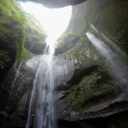 Vandaar was het niet lang meer rijden naar "Madakaripura Waterfall". We wisten niets over deze plaats, want het zat bij in de toer zonder dat we er iets over hadden kunnen opzoeken. We werden volledig omver geblazen door hoe mooi deze waterval en de route er naartoe is. Eerst achter op een brommertje bij een Indonesiër om door de heuvels te rijden naar de start van het wandelpad richting de waterval die tussen en onder twee bergen loopt. Deze wandeling was al prachtig, maar eenmaal bij de waterval aangekomen viel onze mond open: een 200 meter hoge waterval tussen de bergen die neerkomt in een meertje in een grot. De foto's doen de plaat zelfs geen eer aan. Echt een aanrader.