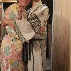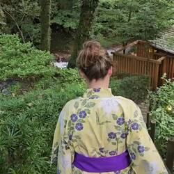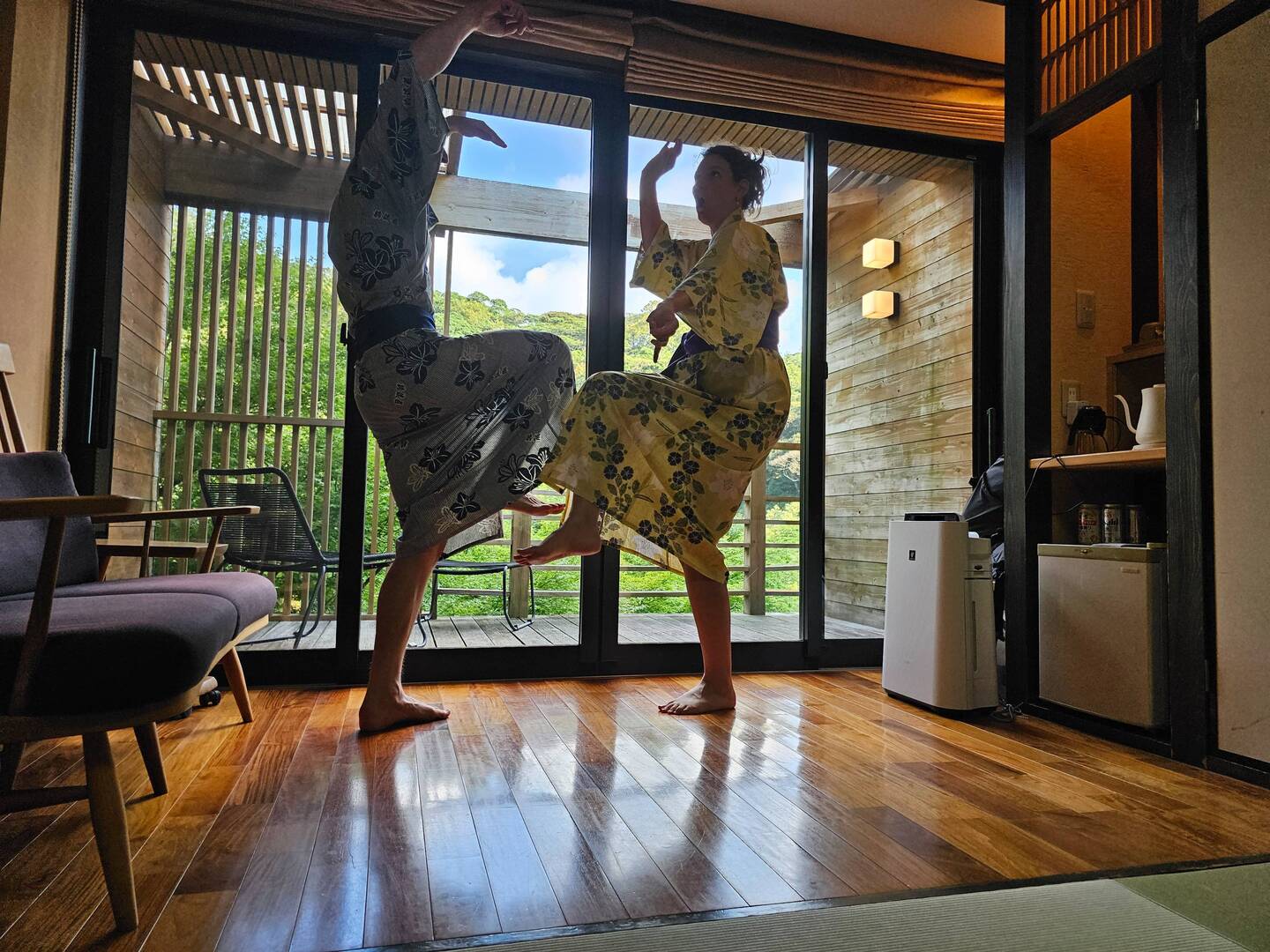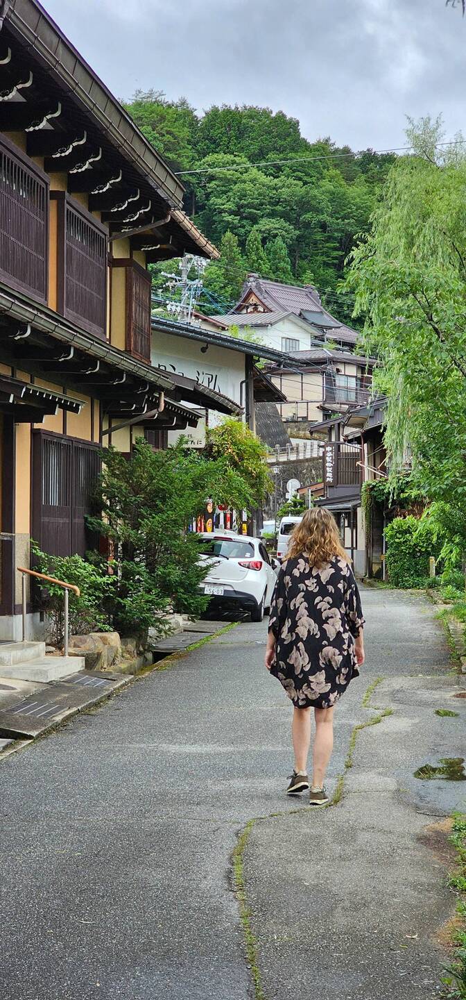 Vermoeid, bezweet en buiten adem kwamen we terug aan in onze verblijfplaats. Wat ook typisch is aan ryokan, zeker in deze gebieden, is dat er meerdere onsen aan verbonden zijn. We krijgen dus een hele uitleg over de privé en gedeelde warmwaterbronnen in de ryokan zelf en ook over de publieke baden naast de rivier een paar honderd meter verderop. Say no more! Dat kunnen we echt wel gebruiken na zo'n bergwandeling. Eerst krijgen we nog een toer van onze grote kamer met tatami vloer, maar dan hijsen we snel onze tatami's in een kimono en haasten (wat moeilijk is, aangezien je enkel kleine stapjes kan zetten) ons naar de baden naast de rivier.