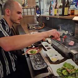 's Avonds eten we voor de tweede keer deze reis in een Izakaya- deze keer is het eentje waarbij de chef gespecialiseerd is in tempura, waarbij verschillende ingrediënten in beslag worden gedoopt en nadien gefrituurd worden. Denk: alle soorten vis en groentes die je je kunt voorstellen. Alles wordt weer vlak voor onze neus bereid en iedereen is enorm vriendelijk. Eigenlijk is zo'n Izakaya een beetje de Japanse versie van tapas. Je bestelt wat hapjes en een drankje. Na een tijdje nog een ronde. En nog één... Totdat je genoeg hebt. Eva en ik bedenken spontaan de term 'Japas' en we hebben nu al een idee voor een restaurant in België...Læs mere