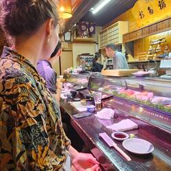 Ook de avond is een schot in de roos: we hadden eerst gedacht om bij een overdekte food market te gaan eten waar verschillende standjes allerlei lekkerheden verkochten. Toen we er echter aankwamen, zagen we meteen een lange rij met enkel westerlingen. Op zich niets mis mee, maar toch een rode vlag als er geen enkele Japanner zelf gaat eten. We besluiten wat door kleine straatjes te wandelen en gaan lukraak een Izakaya binnen: Otafuku sushi. Een Izakaya is een soort van combinatie van een heel kleine bar en restaurant waar je enkel aan een toog naast elkaar gaat zitten en de chef staat aan de andere kant en bereid recht voor je neus de gerechten. Het enige dat tussen jou en de chef ligt zijn grote stukken verse vis. Er zijn nog net twee plaatsjes in dit familie restaurant: de grootvader maakt de tempura, de vader is de sushi koning, moeder en dochter zorgen voor de wederom extreem vriendelijke bediening. We kiezen de menu van de dag met nog extra sushi en wat een heerlijke keuze! Toen de extra sushi op tafel werden gezet, slaakten we allebei een kreet van blijdschap waardoor de chef heel erg moest lachen en zichtbaar genoot van het compliment - wij van de lekkere sushi en de hele ervaring! Toen hij ons nadien nog vroeg waar we vandaag kwamen, spiekte hij even op z'n gsm en zei nadien "bédankettu" - jij ook bedankt, sushi koning!