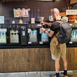Om te bekomen drinken we een zalig koele mirin met veel ijsblokjes terwijl we onze voeten laten rusten na 30.000+ stappen (23,43 km).Læs mere