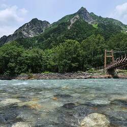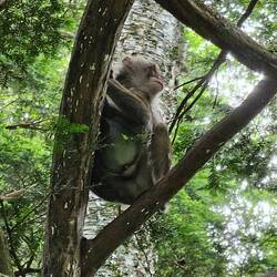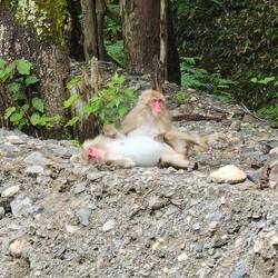 Wij gingen vandaag die massa aan eten goed nodig hebben, want Kamikōchi stond op het programma. Dit natuurpark ligt een uur verder met de bus en is vooral bekend voor de "Kappa brug". Hordes toeristen komen met de bus naar daar, stappen 100 meter, nemen een foto op brug met bergen op de achtergrond en zijn weer weg. Het park heeft echter veel betere uitzichten als je de moeite neemt om verder te wandelen, weg van de coffee shops en souvenirwinkels. Na een drietal km zie je bijna niemand meer. Alleszins, toch geen mensen meer. Na een serieuze wandeling naast de rivier met het ene mooie zicht na het andere, besloten we om terug te keren. Hier en daar pauzeerden we even om wat trail mix (noten, m&m's, gedroogde vruchten...) naar binnen te steken, wanneer we ineens bosjes zien bewegen naast de wandelpad... Het waarschuwingsbord dat we eerder zagen dat er die dag al enkele beren waren gespot, schiet ineens door ons hoofd. Zo'n belletje aan je rugzak helpt voor geen meter... Gelukkig waren het geen beren, maar Japanse makaken. Deze pluizige doerakken met grote tanden waren in groep van de bergflank aan het komen. We zien er één, twee, drie... maar horen er twaalf, dertien... Boven ons zitten er in een boom, klimmen er naar beneden... Heel gerust zijn we er niet aan, dus we besluiten verder te wandelen zonder oogcontact te maken. Een beetje verderop passeert er nog eentje die rustig een plasje doet terwijl we er naast wandelen. Zij zijn duidelijker veel geruster dan wij.