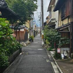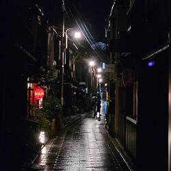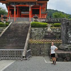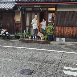 We sluiten ons echter niet op met al dat eten, we gaan Kyoto ontdekken! Wanneer we dit willen doen, hebben we voor de tweede keer deze reis een stevige regenbui. En met regenbui bedoelen we: alle hemelsluizen gaan open. Gelukkig duurde deze maar een twintig minuten en konden we schuilen bij een tempeltje terwijl aan de overkant een hondje voor entertainment zorgde. Die had het ook niet zo voor door de regen te gaan wandelen. Het levert wel gezellige foto's op.
