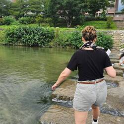Op weg naar huis pikt Eva nog een hindernissenparcours mee door een rivier over te steken op wandelstenen. Vooraleer we Gion Matsuri weer gaan ontdekken aperitieven we op ons appartement. Een echte smuldag vandaag!Læs mere