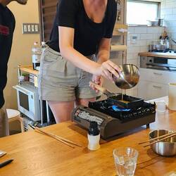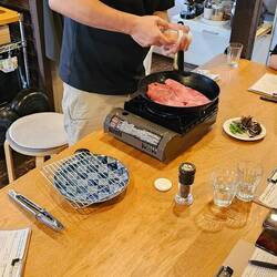 De reden dat we vandaag het noordelijk gedeelte van de stad bezoeken, is omdat we er een kookcursus hebben vastgelegd. Taro geeft al sinds 15 jaar deze cursus gewoon bij hem thuis en het is dan ook geen workshop waarin je allerlei chique gerechten maakt, maar eerder het eten dat ze dagdagelijks eten. We leren er heel veel over dashi, rijst, miso, sojasaus, seizoensgroenten, sake, mirin, eieren, hoe je moet eten als een Japanner ... en ook over de Japanse samenleving, want Taro stond er op dat we zoveel als mogelijk vragen zouden stellen. Bij elk gerecht liet hij ons alle ingrediënten ontdekken, proeven, ruiken... en maakte telkens de grappigste geluidjes. Hmm, ooi, aaah, jaaaa... Naast de dagdagelijkse gerechten, konden we er ook wagyū proeven. Taro wist ons te vertellen dat veel mensen het hebben over "Japanese wagyū beef", maar wagyū betekent eigenlijk al "Japanese beef" (wa = Japan, gyū = beef). Daarnaast zei hij ook dat het masseren van de runderen eigenlijk een marketing stunt is. De malsheid en vetgehalte komt alleen door de soort runderen en omdat ze met graan worden gevoed. Ging er vlot in, zo'n wagyū!