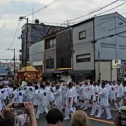 Aangezien we al twee dagen naar Gion Matsuri waren afgezakt, hadden we vandaag niet de intentie om dit nog eens te doen. Toen we echter van de musea naar huis gingen, kwamen we toevallig voorbij de straat waar ze alle praalwagens gingen verplaatsen. Het is immers de laatste dag van het event en dan is er een speciale ceremonie in Yasaka Shrine, vlakbij ons appartement. Duizenden Japanners met niet veel meer aan dan een hemd en een string waar Nicki Minaj "nou nou nou" over zou zeggen, sleuren met de houten constructies over straat. Terwijl ze dit doen, roepen ze allemaal in een ritme "hojteh - hojteh - hojteh...". Is het om een bepaald tempo aan te "hojteh" of alles binnen de string te "hojteh"? We zullen het nooit weten.