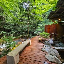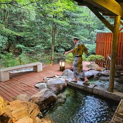 Onze verblijfplaats voor de komende drie dagen hebben we gepast uitgekozen. Ryokan Seiryuso is weer een combinatie van onsen baden en kaiseki avonden zodat we telkens goed kunnen bekomen van een dagje klimmen in de bergen. We worden weer enorm hartelijk ontvangen met een glaasje water en shochu in de lobby en boeken meteen het warmwaterbad naast de rivier. Het is werkelijk één van de mooiste plekken dat we ooit als verblijfplaats hebben gehad. De kamer, het warmwaterbad, de avondmaaltijd met lekkere sake... Een heerlijke, ontspannen voorbereiding voor de pittige wandelingen de komende dagen.Læs mere