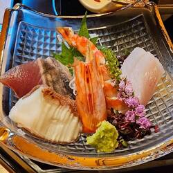 Kawa kogelvis sashimi - complete set Furukawa rauwe houten oren, yuzu en geraspte peper