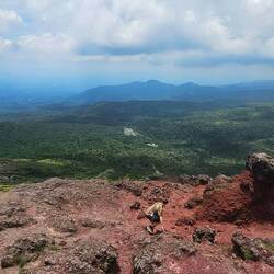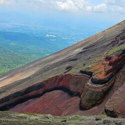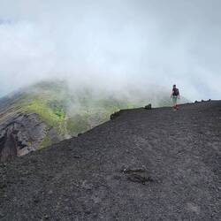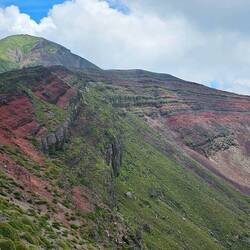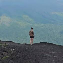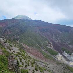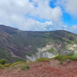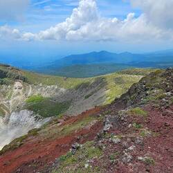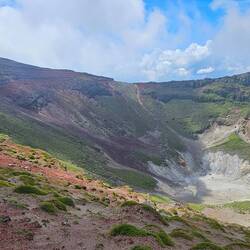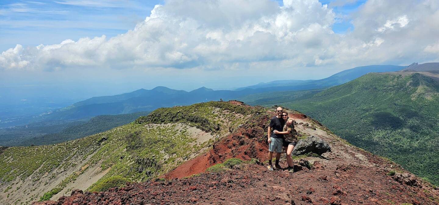 Op een halfuur tijd staat onze auto netjes op de parking aan het begin van de wandeling. De eerste paar honderd meter beginnen heel zachtjes (Eva kon nog lachen), maar vanaf dan is het klimmen en klauteren over rotsen die steeds groter en roder worden (het lachen is gestopt). Er zijn ook bijna geen planten, omdat de laatste uitbarsting redelijk "recent" is (1923, geen zorgen). Het laatste stuk vooraleer we de rand van de krater bereiken is even heel steil, maar dan sta je ineens op een dunne rand (horse's back is de bijnaam, vanwege de vorm en breedte) en krijg je een prachtig zicht op de krater van Ohachi. Sowieso één van de meest unieke uitzichten die we al hebben gezien op zo'n wandeling (het lachen is terug). Het is aan beide kanten heel steil en er staat veel wind - ook al lijkt het op foto's een brede pad, toch zetten we voetje per voetje heel voorzichtig onze weg verder langs de rand. Takachicho ligt namelijk nog een beetje verder en hoger. Aangezien het ondertussen wat bewolkt werd, hebben we op die berg niet veel uitzicht gezien, dus zijn we snel terug gekeerd om nog een hele tijd op de rand van de vorige krater te zitten en een vieruurtje te nuttigen met prachtig uitzicht!