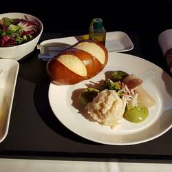 Nach dem Erreichen der Reiseflughöhe werden bereits die Tischchen aufgeklappt. Nach den Knabernüsschen und dem Apérogetränk wird ein exquisiter Hiramasa-Kingsfish mit Algen-Radieschensalat,Læs mere