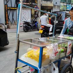 Vorbei an diversen Streetfoodständen geht's heute morgen in Richtung Station Asok. Wobei das mit 'morgen' relativ ist. Die Uhr zeigt bereits nach Mittag an. Trotzdem gibt es bei einer amerikanischenLæs mere