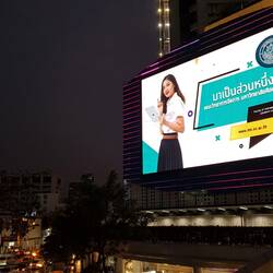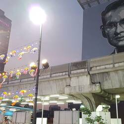 Das Abendrot hüllt Bangkok für kurze Zeit in bezauberndes Licht. Danach übernehmen dies die allgegenwärtigen riesigen Screens. Allgegenwärtig ist auch der König. Sei es der verstorbene BhumibolLæs mere