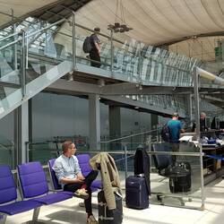 Inzwischen bin ich beim Gate angekommen. Wegen des Ferienbeiginns dauerte es etwas länger als üblich. Im Zug lief mir noch Müthu, mein ehemaliger Scheff, über den Weg. Er wird Sri Lanka bereisen,Læs mere