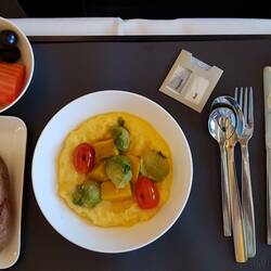 Nach etwas Schlaf und drei Filmen vertilge ich genüsslich das Frühstück. In gut einer Stunde sind wir wieder am Boden.