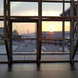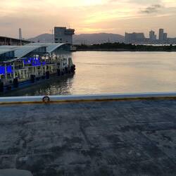 Etwas geschafft und ziemlich müde gehe ich die Rückfahrt mit dem Katamaran an. Leere Abfertigungshallen und ein schöner Sonnenuntergang begleiten mich.