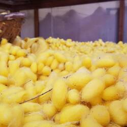 Die Kokons werden anschliessend in ein lauwarmes Wasserbad gelegt, damit die Fäden abgewickelt werden können. Aus 20-25 Fäden, welche bis zu 900m lang sein können, werden mittels Haspelrad jene Fäden gesponnen, welche mittels Webstuhl weiter verarbeitet werden. Dank der reinweissen Farbe des Fadens des Seidenspinners lässt sich die Seide sehr gut einfärben. Selbstverständlich liessen sich die Erzeugnisse im Laden nebenan käuflich erwerben. Ich kann widerstehen - zumindest vorerst. Ich will mir keinen Anzug schneidern lassen und schlage erst am Schluss bei einem Bambus-T-Shirt zu. Ich will herausfinden, ob ich einen Unterschied zu Shirts mit Baumwolle feststellen kann.