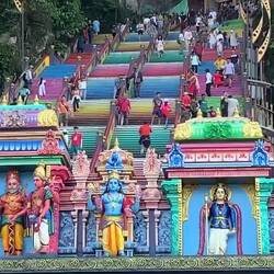 We ummed and ahhed about whether to go to Batu Caves. We have been there before but it was a long time ago and to be honest, apart from the huge staircase I have little memory of it. But it is very different now. From the striking rainbow paint job the staircase has undergone to the addition of the imposing golden statue of Lord Murugan, also known as Skanda, the Hindu god of war, the changes are certainly not subtle.