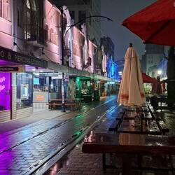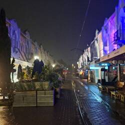 Una via caratterizzata da negozi e ristoranti in un contesto d'epoca