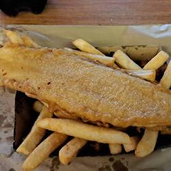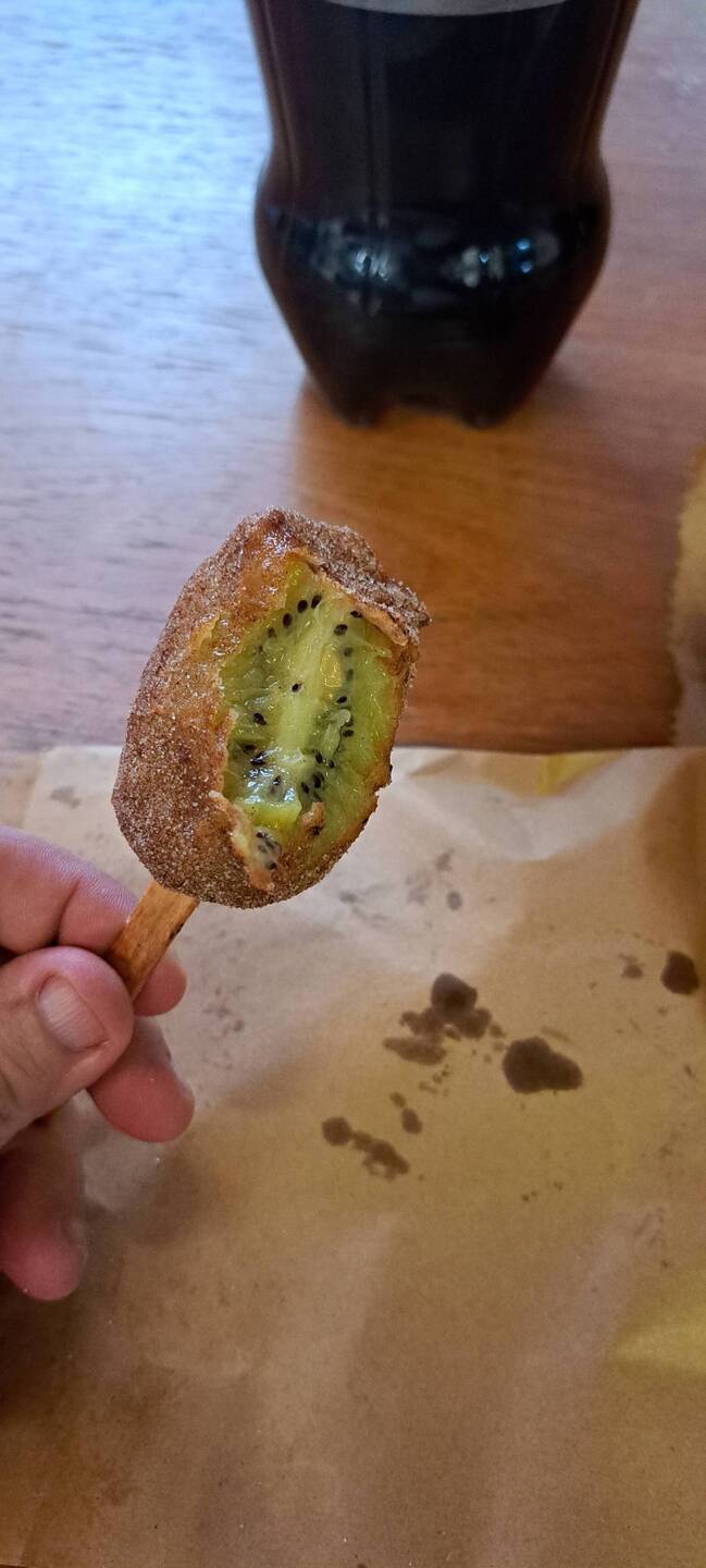 Fish&chips di un pescetto del Pacifico (Hodi). E poi una cosa neozelandese e meravigliosa: kiwi fritto! Mammamia! Sia benedetto chi se l'è inventato!