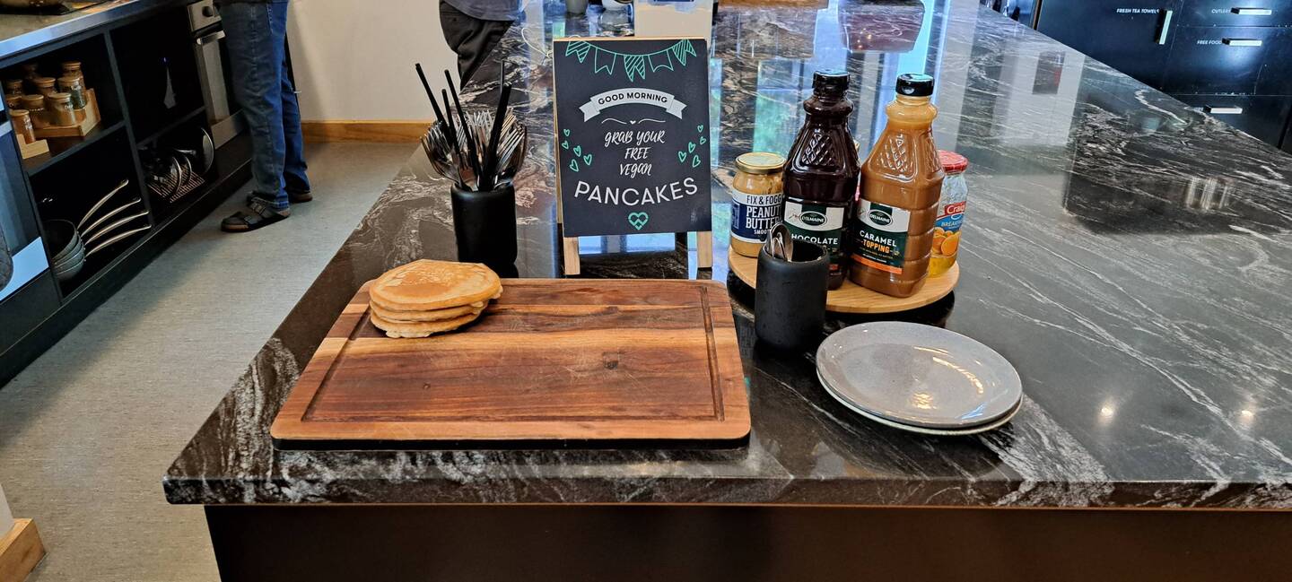 Breakfast offerto dall'ostello, che sabato e domenica prepara pancakes freschi. Peccato non essere qui domani! Nota: tra le salse, faceva capolino anche della robaccia.