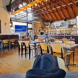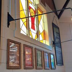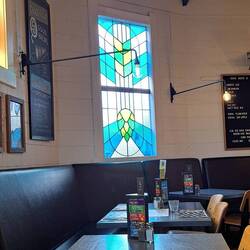 Pranzo in un pub (vuoto causa ora) con sconto. Da fuori pareva una chiesa: ha le vetrate colorate...