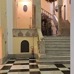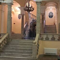 Ha una bellissima scala loggiata che si svolge attorno al cortile interno con fontana. Lo trovi chiuso perché sono proprietà private.