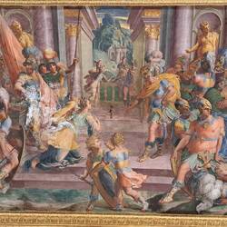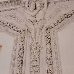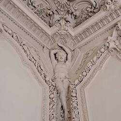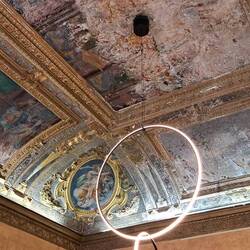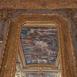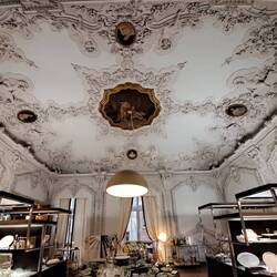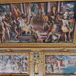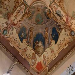 Trovo affascinati quei volti femminili dipinti negli ovali. IN mezzo agli stucchi risaltano elegantenemente. Cosa rappresenta la scena centrale?