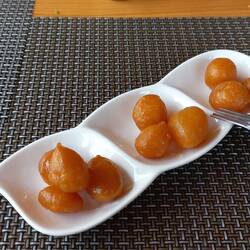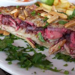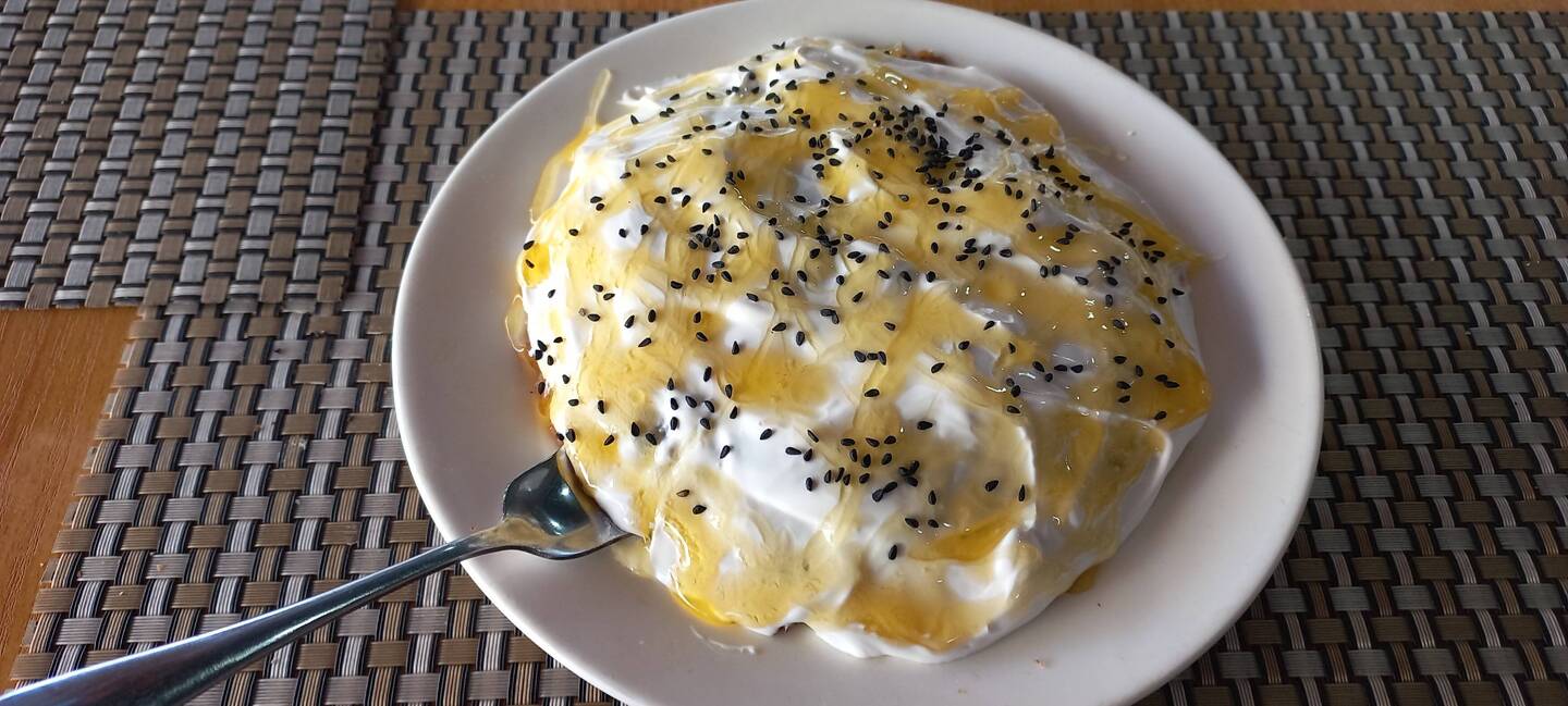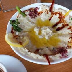 Secondo giro con un fagottino di pollo e granatina, hummus e dolcetti al miele.