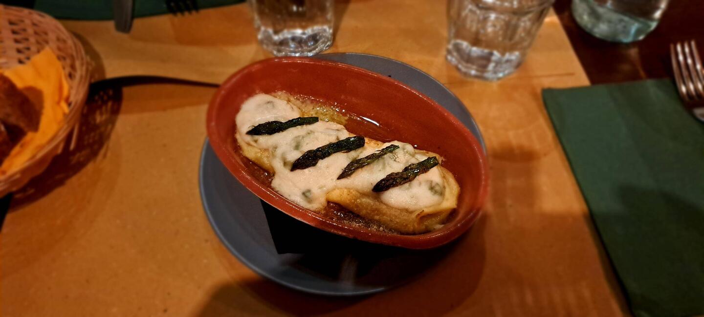 Crespelle crema di parmigiano e asparagi, tordelli al ragù bianco (lucchese!), ravioli di baccalà,もっと詳しく